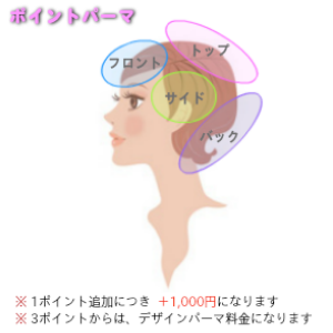 | ポイントパーマ | 3,000円~ | 部分的にパーマをかけます。 セットはカーラー感覚でお手入れ簡単 |