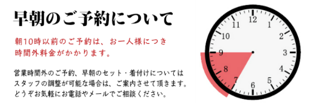 営業時間外のご予約の場合は、下記の時間外料金がかかりますのでご了承ください。